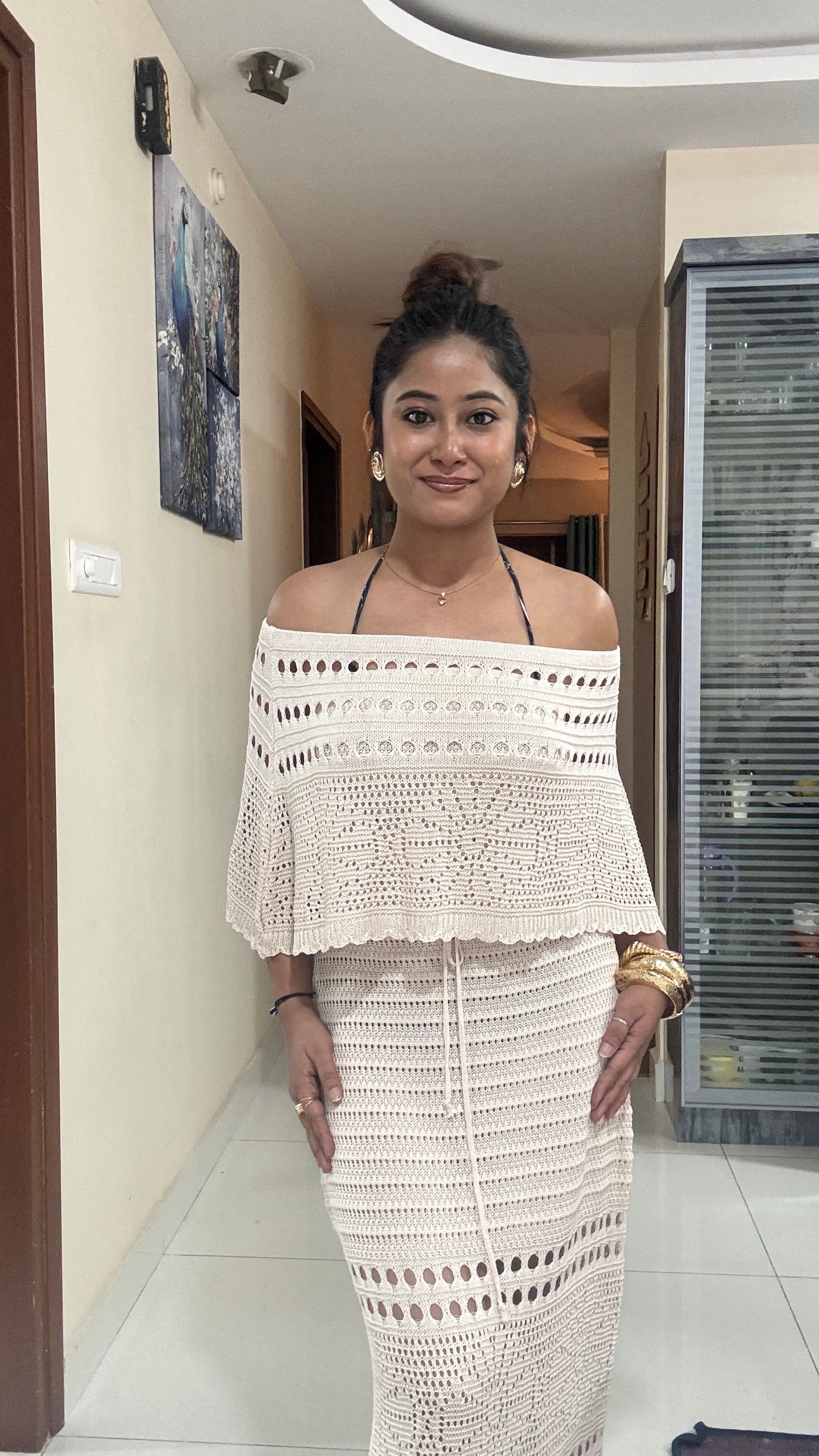 Off-White Long Crochet Off-Shoulder Dress